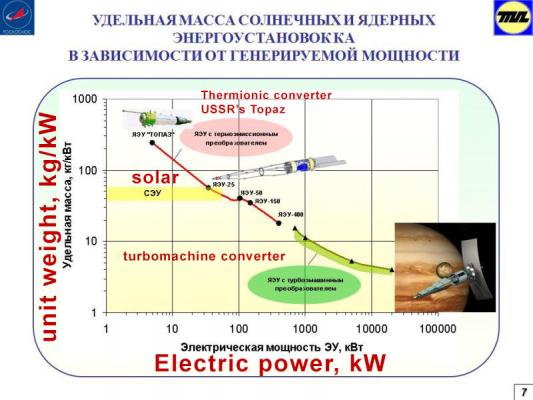 This graph shows the mass efficiency (vertical axis, in kg/KW, lower is better) of Russian nuclear reactors depending on their power (horizontal axis in kW). The red curves is for thermionic conversion reactors, with the top left point being the historical Topaz reactor and the other labelled ЯЭУ-XX the YaEU designs of increasing power as we move to the right. The green curve corresponds to reactors with turbine power conversion like on TEM. They are more interesting than thermionic reactors at high power, with YaEU-400 sitting at 20 kg/kW for 400 kW of power, while TEM is at 10 to 20 kg/kW for 1MW of power depending on the variant.