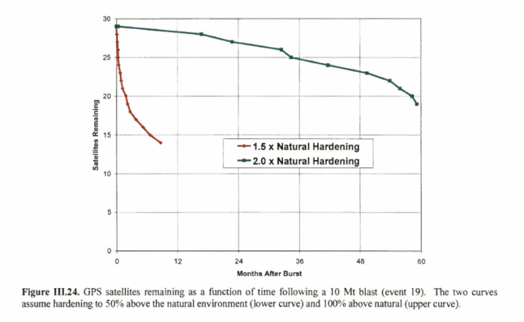 The reason for this might be that shielding has limits: while it is effective against natural radiation, with a 2.5mm aluminium shield reducing the dose by a thousand times, the electrons released by fission are higher energy and the same shield reduces the dose by less than 10 times. And some components, like solar panels, cannot be easily shielded. The most powerful bursts of the DTRA report can take them to their end-of-life radiation limit.