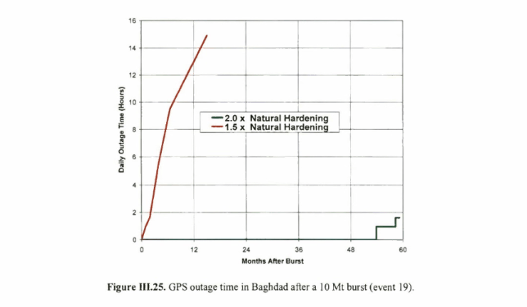However, such explosions at high latitudes have never been tested, so there are large uncertainties in their effects. And because of the collateral damage, and the fact that it would violate the 1963 Test Ban Treaty which prohibits doing detonating nuclear weapons in space for testing, it is unlikely their ever will. If they behave as predicted, with very large yields they could shave years off the lifetime of GPS satellites, creating gaps in coverage, but not immediately: