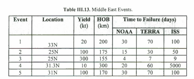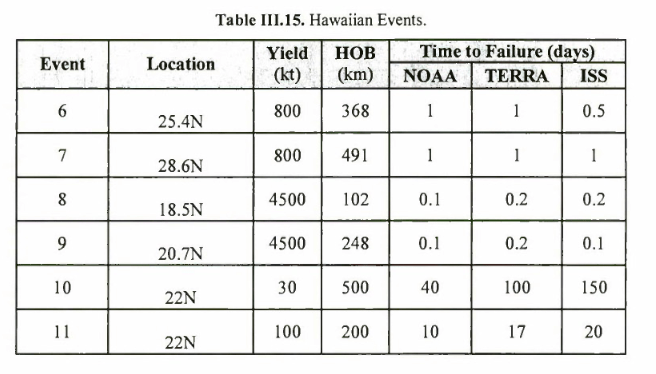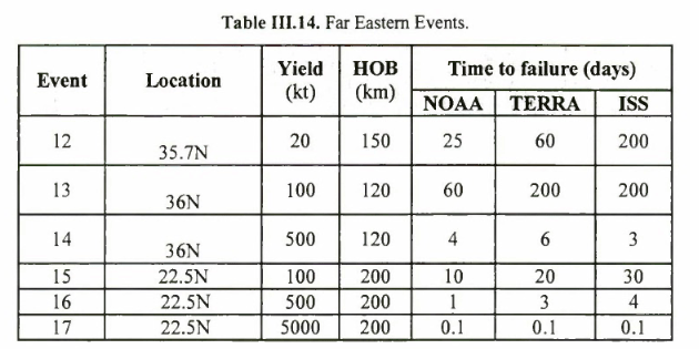The DTRA report includes the following tables, detailing the delayed radiation effect on LEO satellites for various simulated detonations. NOAA is in a 800km polar orbit, TERRA in a 700km polar orbit and ISS is in its 320km x 52° orbit, but contrary to the others its radiation limit is the lethal dose to the crew. For the artificial satellites, it is assumed they fail after receiving twice the total natural radiation they would have received during their normal lifetime: