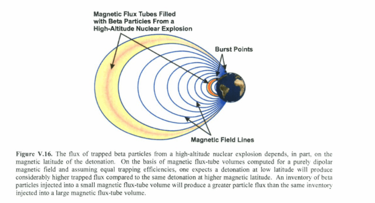 The last and most important effect of the detonation is that it produces high-speed electrons through the decay of the unstable isotopes created by fission. They spiral around the magnetic field lines, like the electrons for EMP, and bounce back and forth between two “mirror points”. If these points are at a high enough altitude, the electrons stay in complete vacuum, so they persist for a long time. If they end up hitting a satellite, they carry enough energy to cause damage to its electronics.